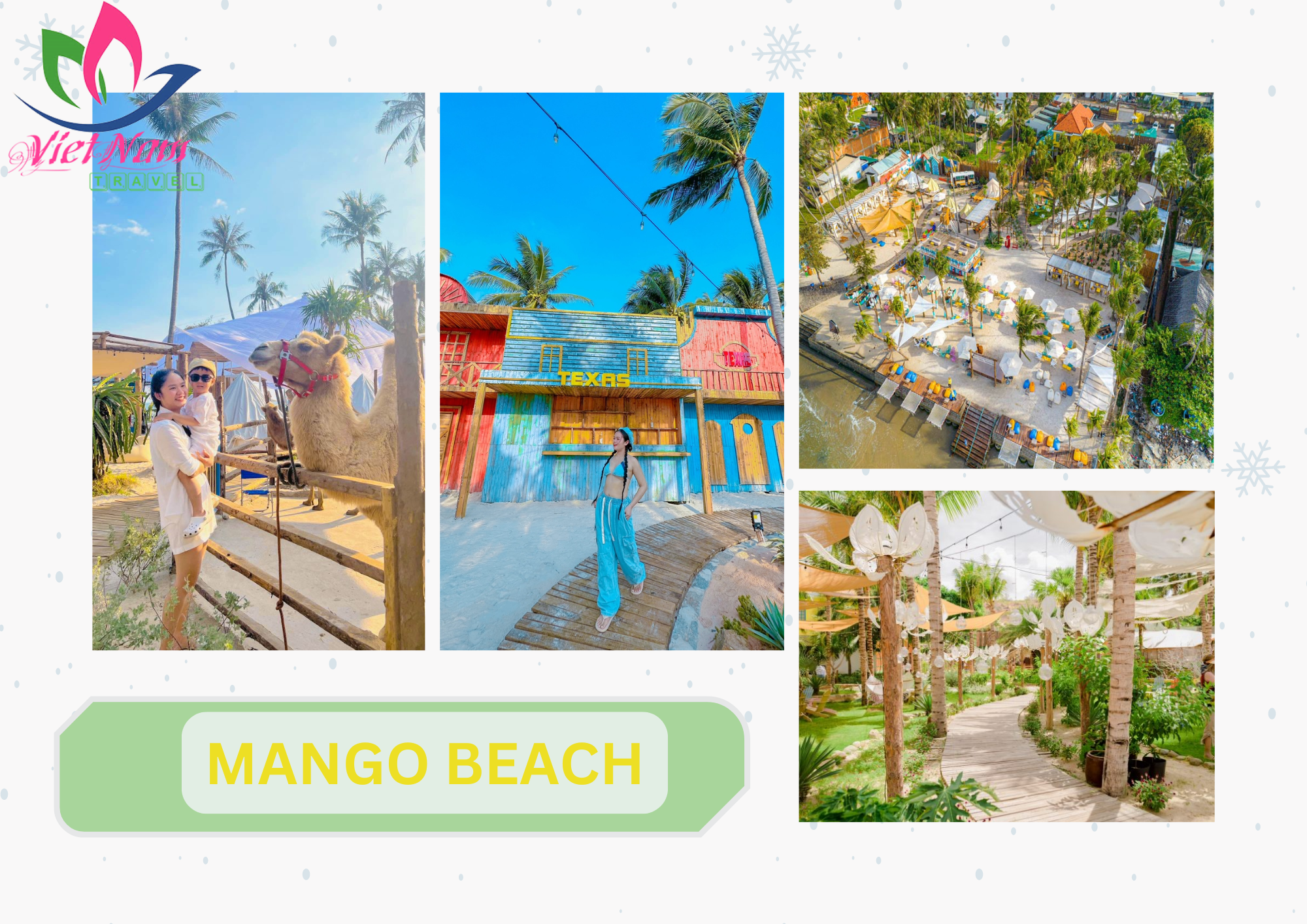 - 15h30: Đoàn tham quan Mango Beach – nơi cung cấp nhiều tiện ích cho du khách tận hưởng khi khám phá thành phố biển Phan Thiết: vườn thú mini, nhà hàng cũng như các chương trình biểu diễn trực tiếp và DJ vào mỗi cuối tuần. Khu vườn động vật kì lạ là một niềm vui thực sự, có các sinh vật duyên dáng và thân thiện như Alpacas, Ngựa con thu nhỏ, rùa, thỏ,… Đặc biệt nơi đây còn là điểm ngắm hoàng hôn trên biển cực lãng mạn chắc chắn sẽ mang lại cho Quý khách những phút giây trải nghiệm đáng nhớ ở Mũi Né. ( Quý khách được tặng một phần nước tự chọn tại đây).